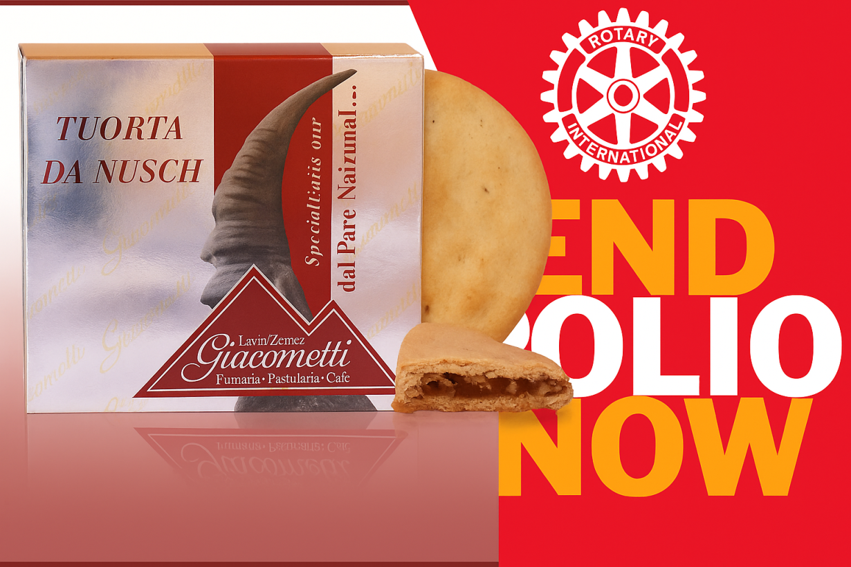 Sur lâinitiative de notre ami Rotarien Oliver Rosenbauer, porte-parole de l'OMS pour l'Ă©radication de la polio, nous pouvons vous proposer la cĂ©lĂšbre « Tuorta da Nusch » de la confiserie familiale Giacometti à  Lavin, en Engadine. PrĂ©parĂ©e selon une recette transmise depuis 4 gĂ©nĂ©rations, cette tourte artisanale est reconnue pour sa qualitĂ© exceptionnelle.